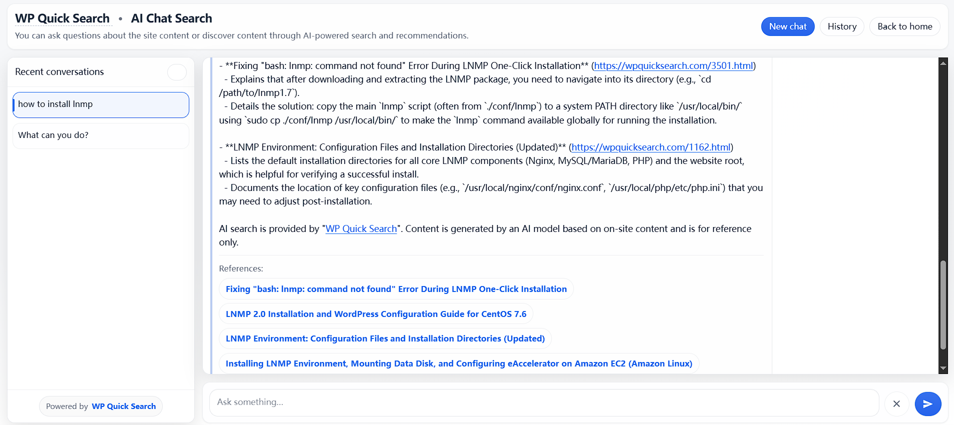 This plugin enhances WordPress site search with word segmentation and fuzzy search capabilities. It replaces the default MySQL query layer, significantly reducing web server load. It also supports AI conversational search. The plugin has been tested on production sites with over 1 million articles, fully meeting the needs of high-traffic, large-scale websites.